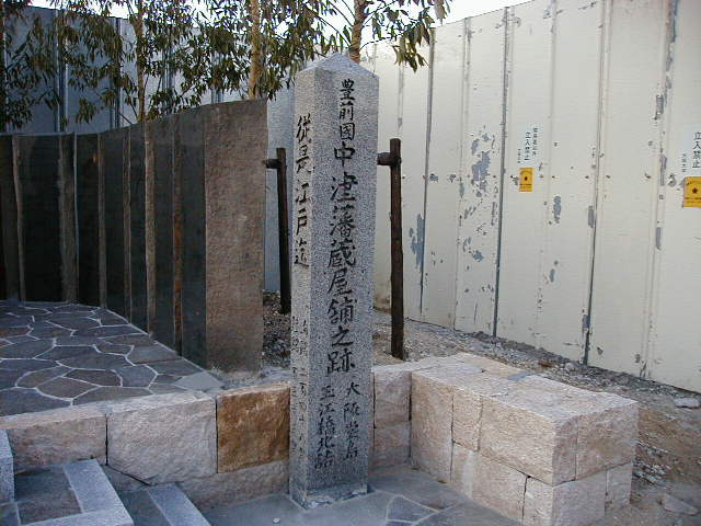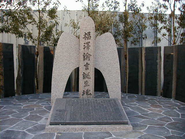 堂島川に架かる 玉江橋北詰の 大阪大学 付属病院 跡地前に昭和 29 年 1 月、慶應義塾社中の建立になる「福沢諭吉誕生地」の碑があり、並んで「豊前国中津藩蔵屋敷之跡」の碑もあります。( 2000 年 6 月現在 阪大病院跡地整備中 )