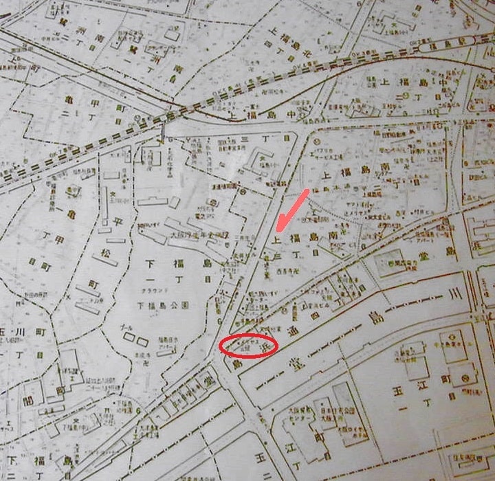 景色が変ってしまって田辺写真館の場所をご自身ではもう記憶が定かではないと仰っているようです。 住所は大阪市此花区上福島南三丁目 40 番地(昭和 18 年以降、同 50 年まで大阪市福島区上福島南三丁目 40 番地)とされていますので地図に当て嵌めてみると だいたい矢印の辺りになります。 地図は昭和 46 年のものなので住所表示は同じ。 広い道路は あみだ池筋、赤い楕円はメリヤス会館でメリヤス会館と福島西通交差点との中間ぐらいです。