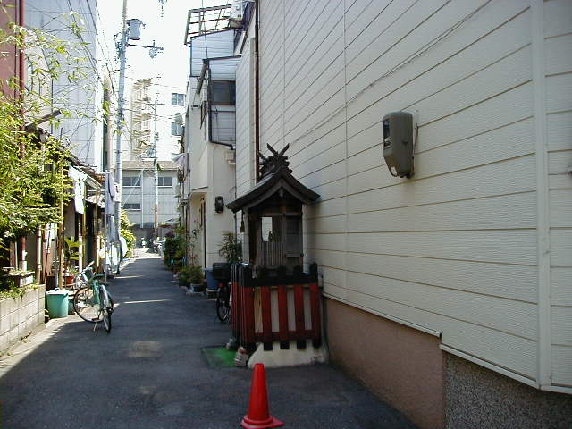 由緒は分かりません。 近所のおじいちゃんに聞いたのですが、戦前からあったということでした。 誰かが最初に建てたと思うのですが、最近まで面倒を見ている家の人が亡くなっていて詳細は不明です。 ただ路地の道幅が違うことがおもしろい。 お稲荷さんのある位置が、もともとの道幅です。 奥は戦後 家が建てられたときに狭まったようです。 このあたりも空襲で焼けた場所です。