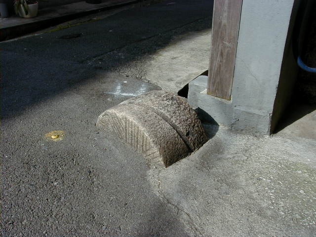 路地の曲がり角に埋められた「石臼」です。 このあたりで農業が行われていたのは明治後期までだと思いますが、江戸時代の道標や橋の欄干などが使われていることもあるそうです。 さすがに道祖神は埋められることはないでしょうが、そういうのが お地蔵さんと一緒に祭られている正体不明の石仏かもしれません。