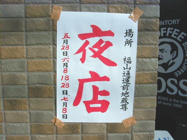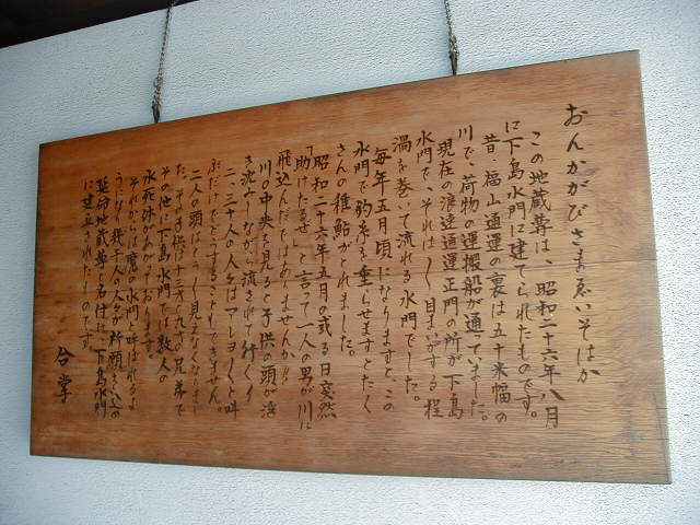 夜店の貼紙に書いてある「福山通運前の地蔵尊」です。 由緒は看板に書かれています。 ここに水門があった頃の水難者慰霊のために建てられたそうです。 北港通りが運河(川)だった頃ですから、昭和 20 年代まで水門がありました。 今は跡形もありません。 ここは中津川、正連寺川、六軒家川、木場川などの分流点でした。 木場川も現在は埋め立てられてありませんが、摂津製油横の道などは長い間水溜りのようになっていました。