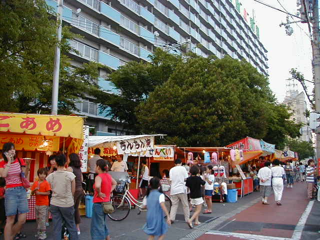 夜店の説明はするまでもないと思いますが、一般に「テキヤ」と言われる人が路上などで移動可能な簡易店舗で営業しているものです。 こう言うと何のことやら分からないので以下の写真を見てもらう方が早いです。 福島区を氏地とする神社の夏祭前に夜店が開かれてゐます。 夏祭の時にも参道などに夜店が出ますが、それとは別に行われています。
