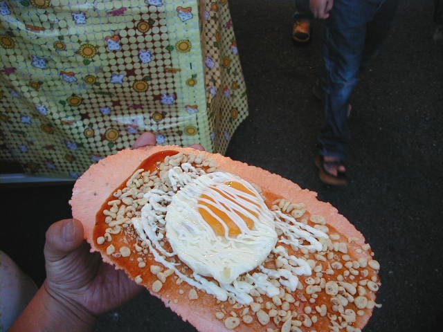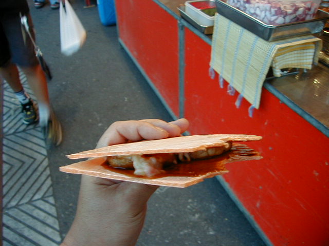 これは最近の食べ物です。 はし巻き お好み焼き。 割り箸にクレープ状の生地を巻きつけてあります。 店の兄ちゃんに聞いたところ、お好み焼きの生地とは違うそうです。 どちらかと言うと洋食焼きに近いそうです。 中味にチーズが入っています。