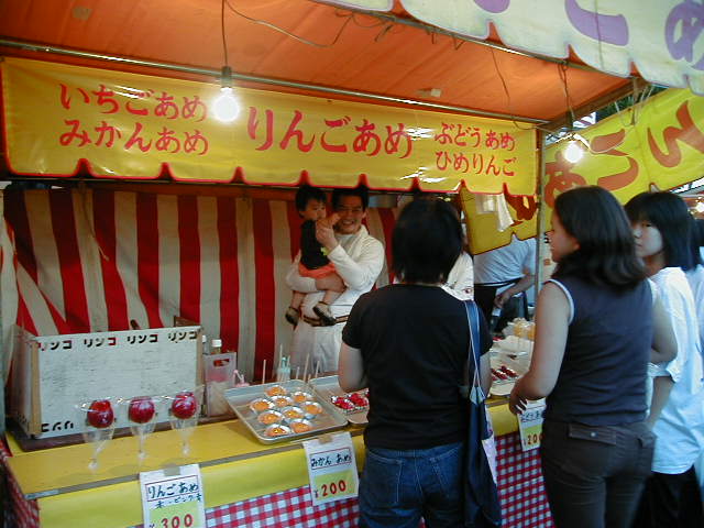 ご存知「りんご飴」。 これは夜店の定番でしょうか。 売れ筋は 200 円のリンゴ飴らしいのですが、ここの兄ちゃんは自分のセガレを お客さんに自慢していました。 お客も「あ、カワイイ」とか言いながら付き合っているように見えます。 油を売っているリンゴ飴屋さんでした。