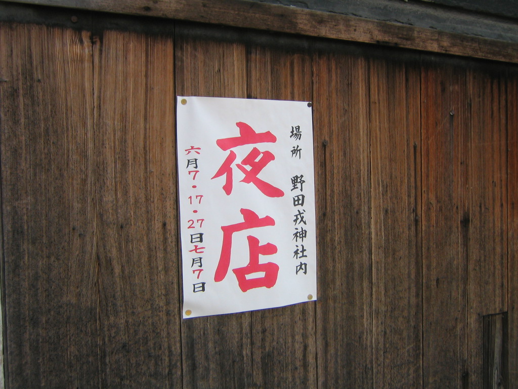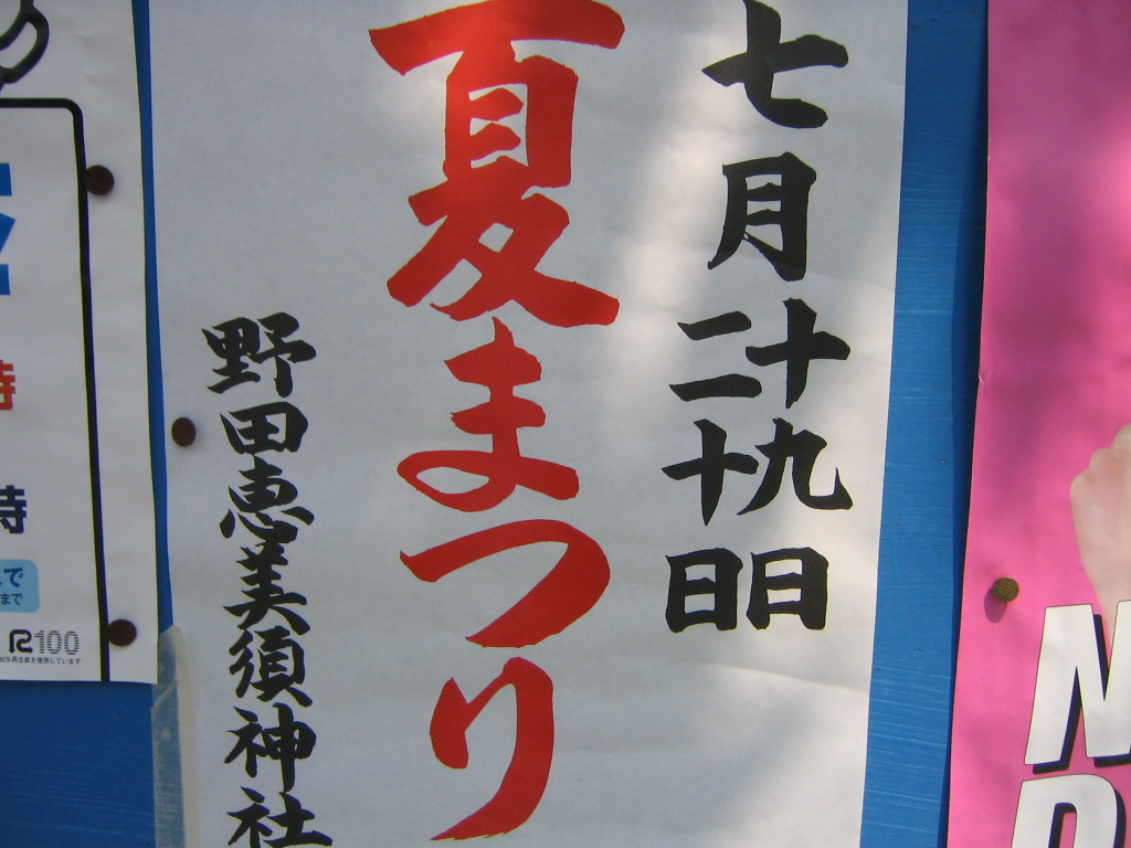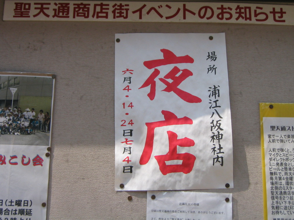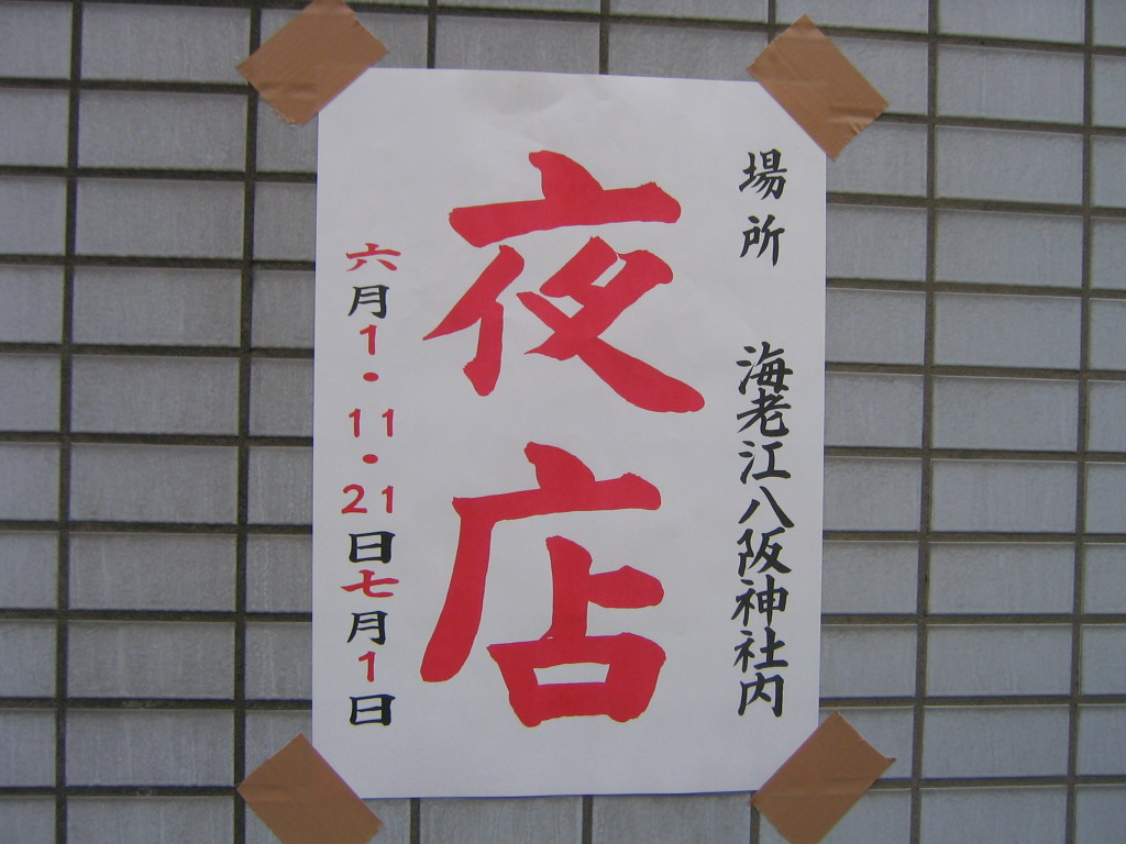案内など不要というか時期になれば区内のいたるところに夜店の貼り紙が出ています。 場所と開催日が書いてあるだけの簡単なものですが、これを見れば分かるはずです。 とはいえ、この内容ではよく分からない人もいるかも知れませんので、ざっと案内します。