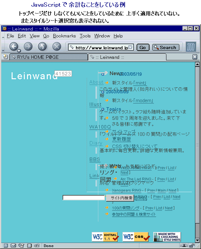 偉さうな事を言ふオマエはどーなんだ、と思はれる人もゐるでしょう。 無禮のお詫びのシルシに Tips を載せました。 CSS と JavaScript を HTML に組み込んでゐます。 斯う言ふと DHTML のグルグル動くヤツだと思はれさうですが、そんな子供騙しを作る氣はありません。