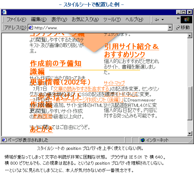 CSS でする配置などは安全かといふと決してさうではありません。 特に position は値が absolute のときは固定的です。 固定配置は環境が少し變はるだけで重大な問題が生じます。 CSS をまったく適用されない環境なら話は簡單ですが、IE の「ユーザー補助」のやうに一部のプロパティを無效にしたときに潰滅的な結果になる場合があります。