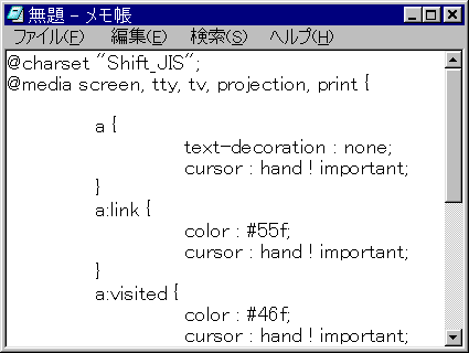 これは何をするスタイルシートかと言ふとリンク部分の表示を設定してゐます。 ページのテキストリンクの部分は色が違ったり下線が附いたりしますよね。 それを設定してゐます。 で、肝心なのは色や下線ではなく、カーソルの形狀です。 これを勝手に變へてゐるページが結構あります。 リンクの部分で こ~んなふうに してゐるページを見たことはありませんか。 もし遭遇したことがなければラッキーです。 これは迷惑なので標準カーソルまたは自分が使ひ易いカーソルに強制的に戾さうといふものです。