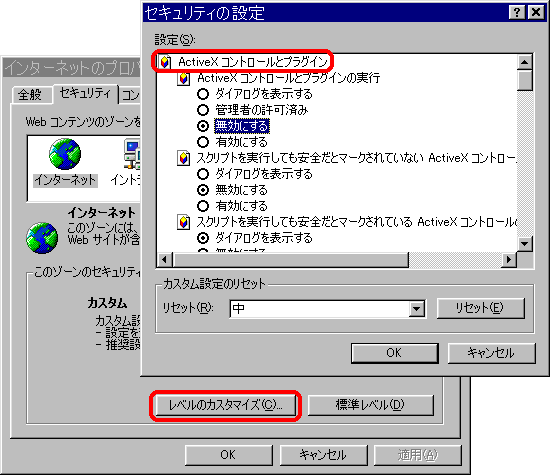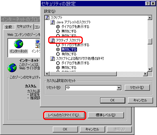 JavaScript を OFF にする爲には、「アクティブスクリプト」の項目の 無效にする にチェックを入れます。 FLASH や 音樂・映像を再生するソフトを立ち上げない爲には、「 ActiveX コントロールとプラグイン」の項目 すべて無效 にしておきます。 これらはリセットボタンで元の設定に戾せます。 詳しくは圖をクリックしてみて下さい。