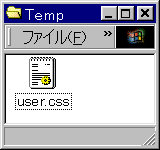 このやうに書き込めたら OK です。 これを保存しますが、だいたい見當が附きますね。 さうです、始めにブラウザの設定でファイルを置く場所を指定しましたが、そこへ「名前をつけて保存」します。 こゝで氣を附けなければいけないのは、擴張子は必ず .css でないといけません。 いや、實際には .css でなければならない訣でもないのですが取り敢へず。 で、メモ帳なら 次のやうに指定して保存して下さい。