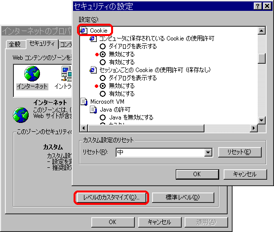 訣の分からないものがグルグル動いたり、音樂が鳴るのは未だ輕症かもしれません。 本當に怖いのは表面に現れない物です。 ActiveX や WHS などは、PC 内のファイルを讀み書きできます。 また Web で頻繁に使はれる代表の Cookie (クッキーファイル)ですが、これもセキュリテイタブ内で無效にできます。(圖はクリックで大) クッキーは無效にしておいても、閱覽で特に困ることはありません。 クッキー無效で閱覽に困るやうなサイトへは行かない事。