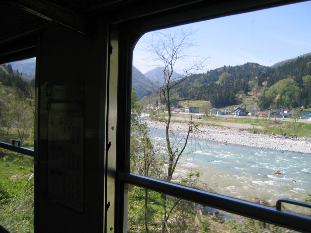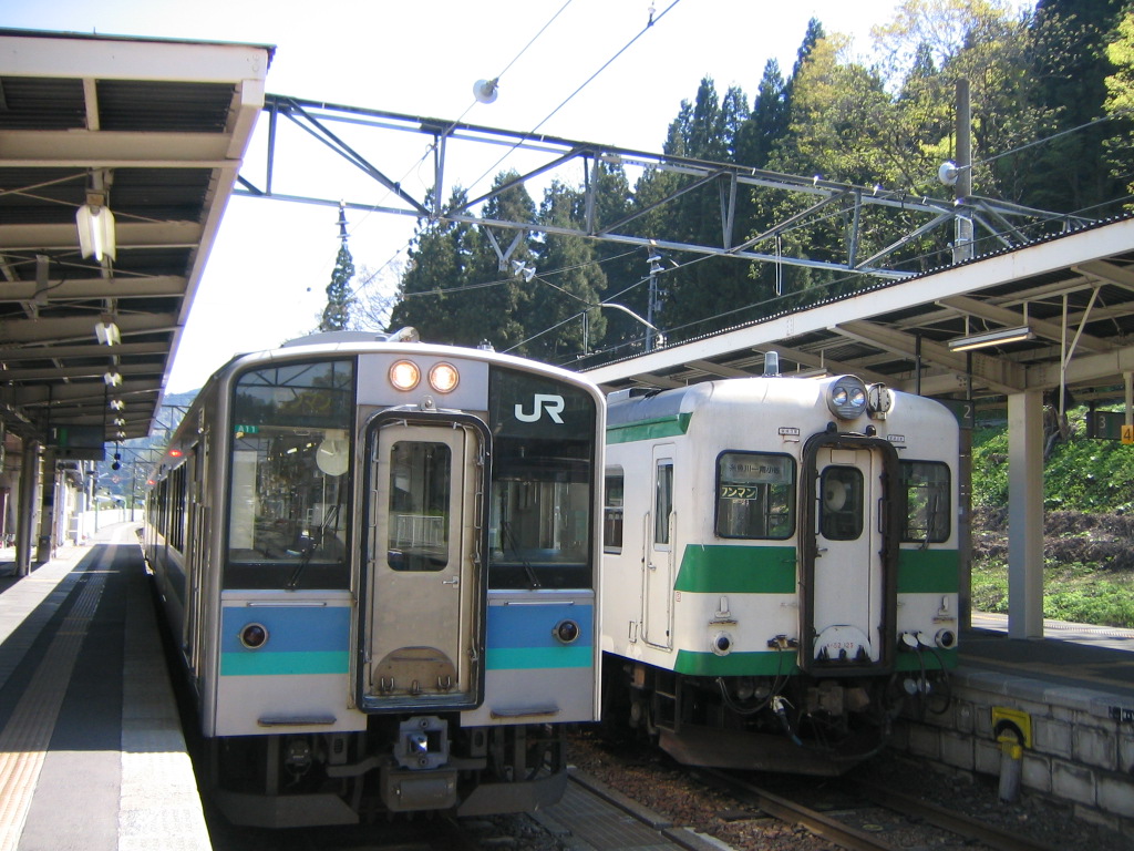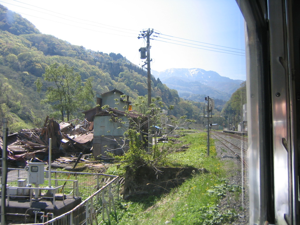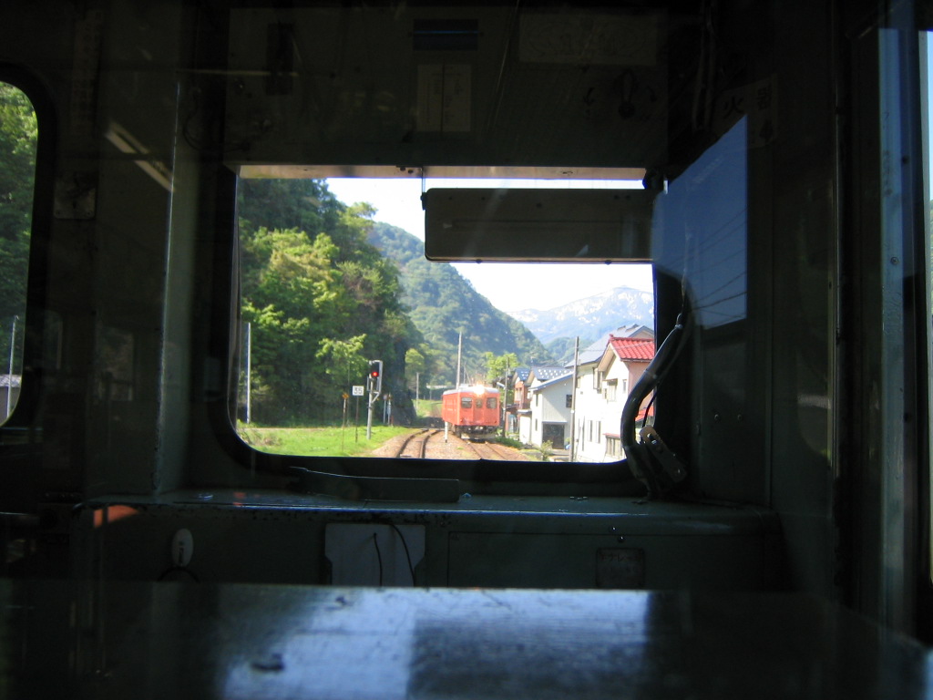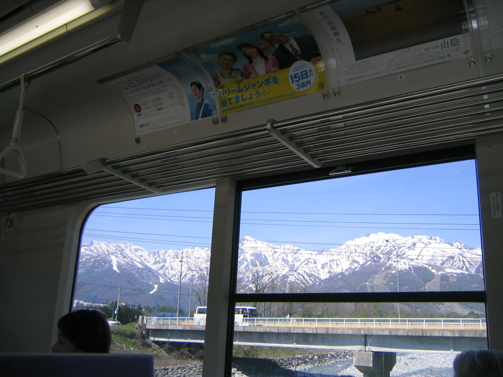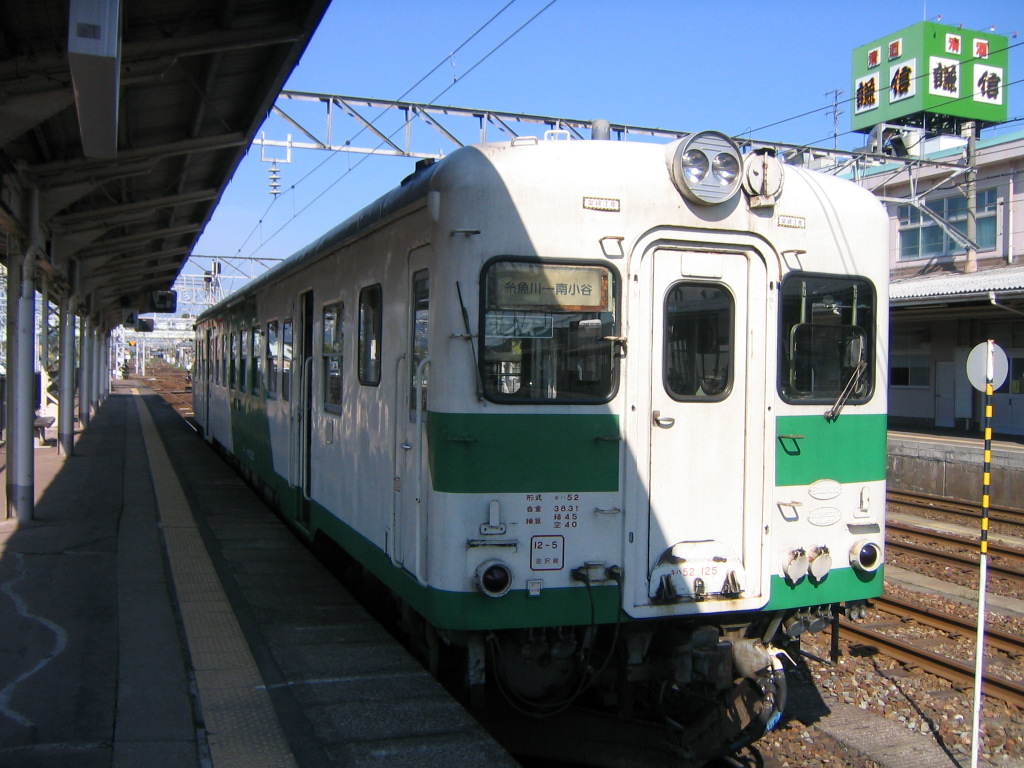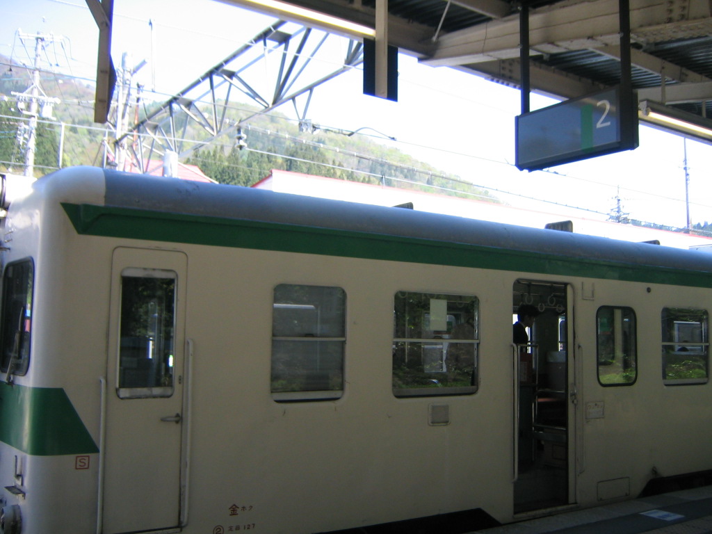 - 南小谷でキハ 52-125 から JR 東日本のクモハ E127-111 (二輛編成)に乘換へると急に都會的な雰圍氣になります。 車内には JR の鎌倉へ行かうといふポスターもあり「白馬」のハイセンスなイメージの新しい型式の電車でした。 新潟縣側と長野縣側のギャップが大絲線に乘る樂しみかもしれません。 車窗からは北アルプスの山々が手に取るやうに見えます。 2006 年 5 月 15 日撮影。