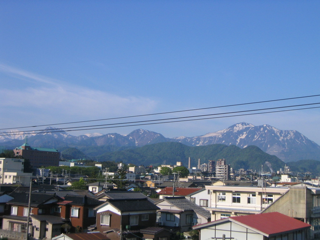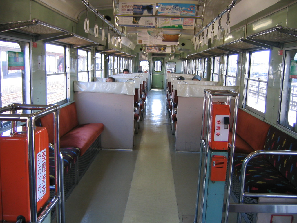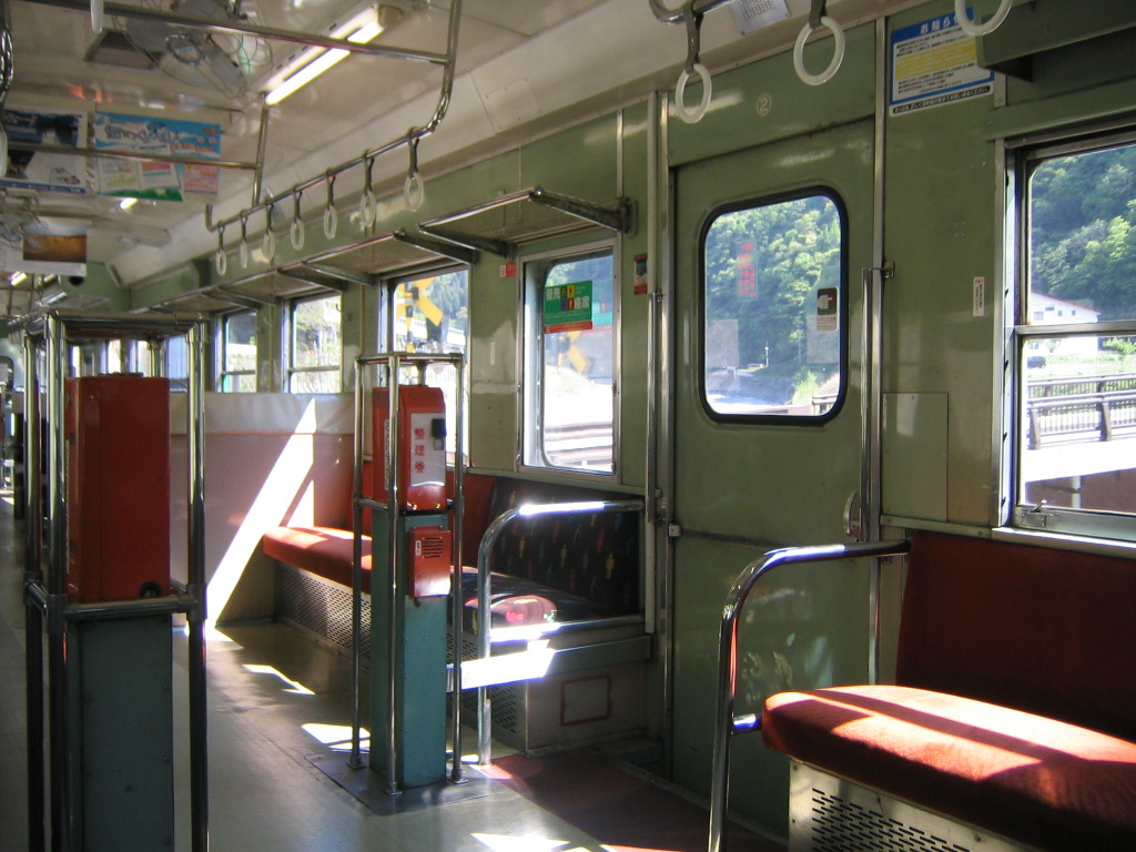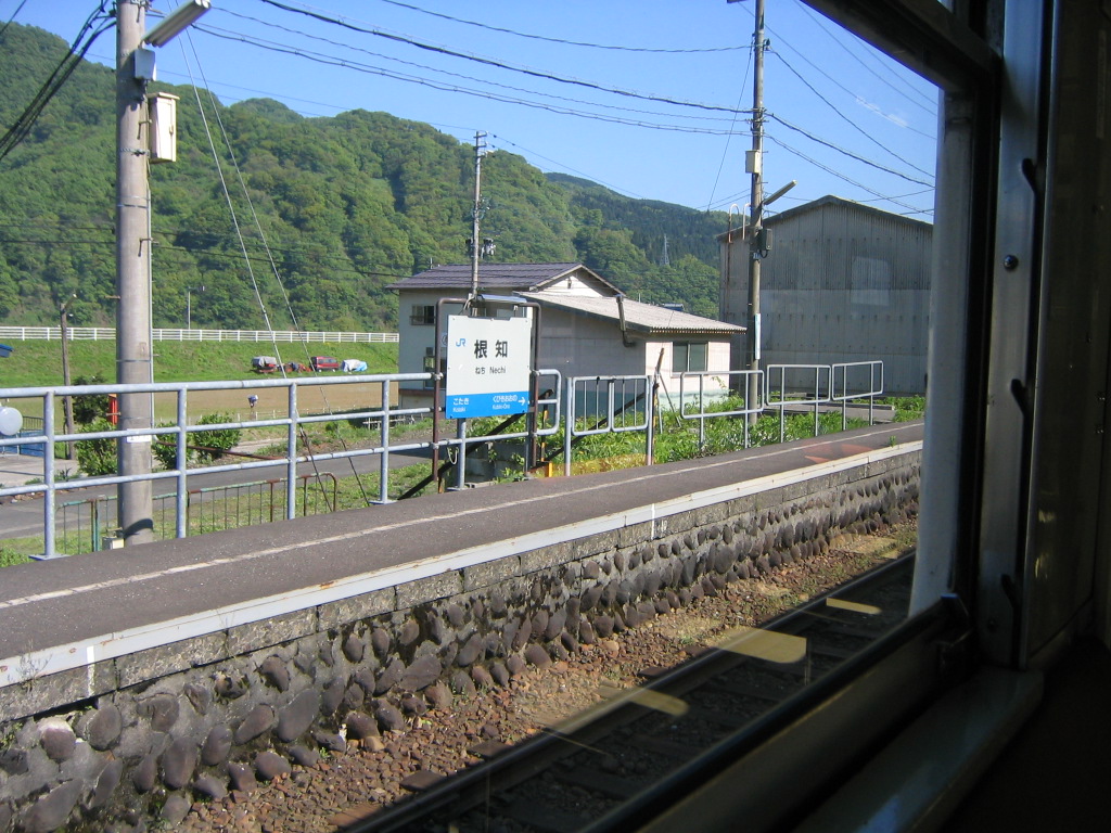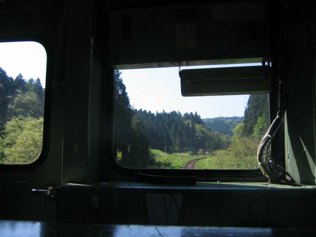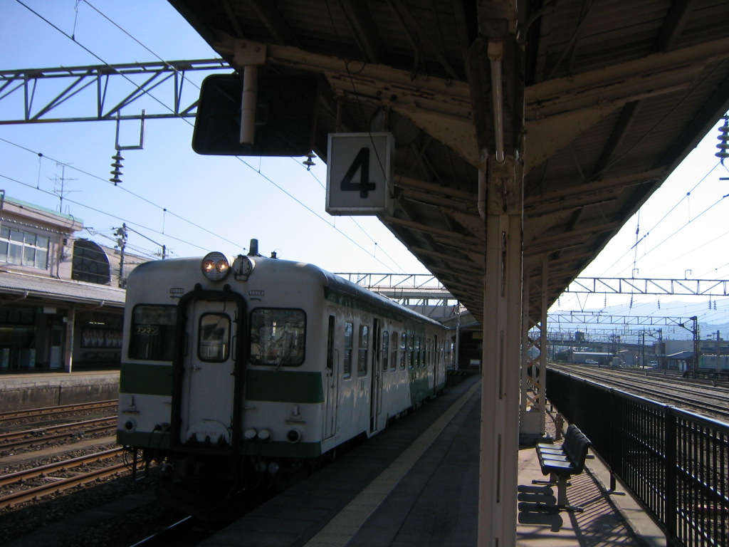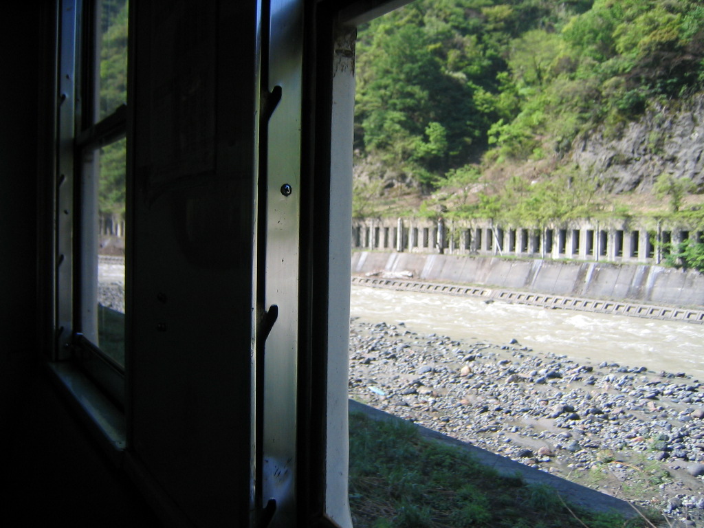 - 南小谷でキハ 52-125 から JR 東日本のクモハ E127-111 (二輛編成)に乘換へると急に都會的な雰圍氣になります。 車内には JR の鎌倉へ行かうといふポスターもあり「白馬」のハイセンスなイメージの新しい型式の電車でした。 新潟縣側と長野縣側のギャップが大絲線に乘る樂しみかもしれません。 車窗からは北アルプスの山々が手に取るやうに見えます。 2006 年 5 月 15 日撮影。