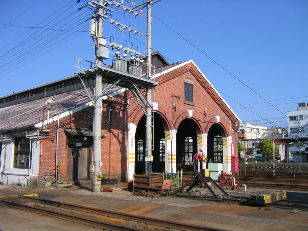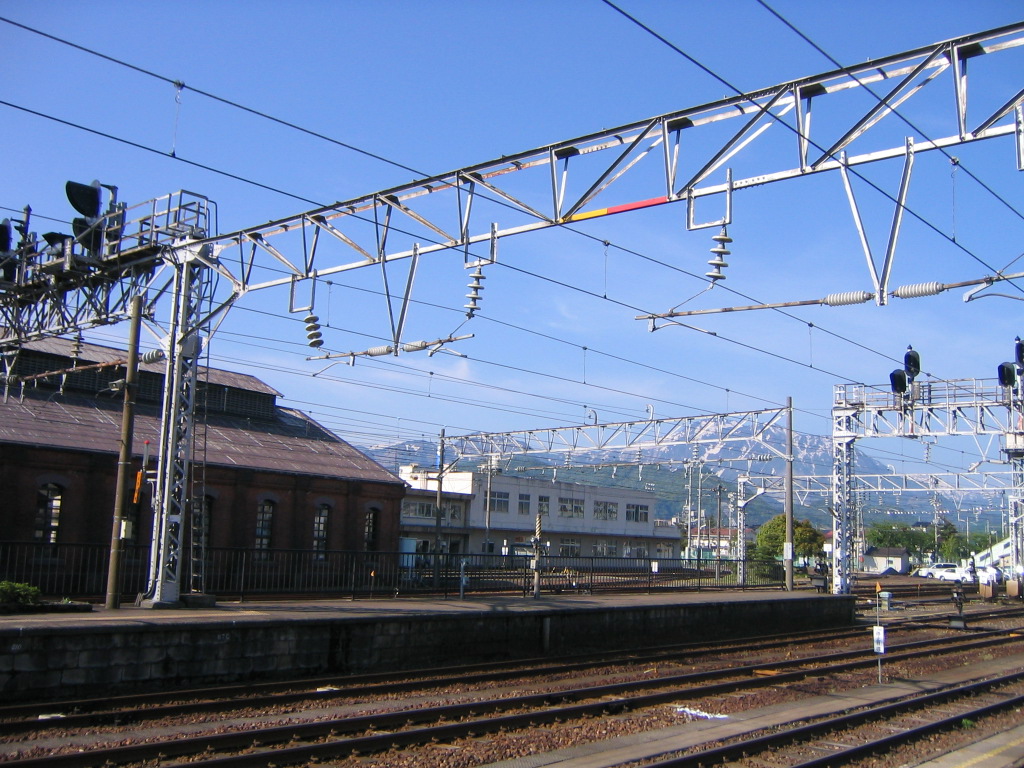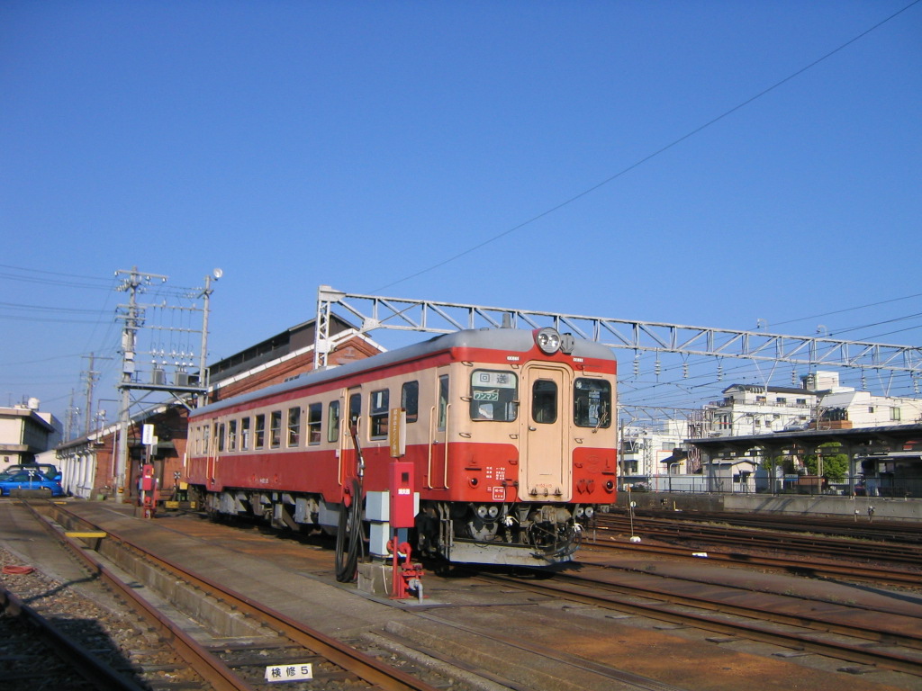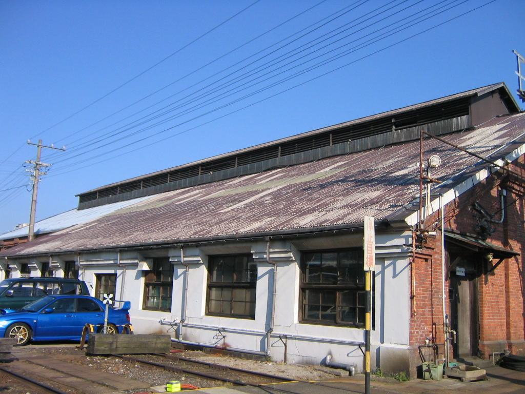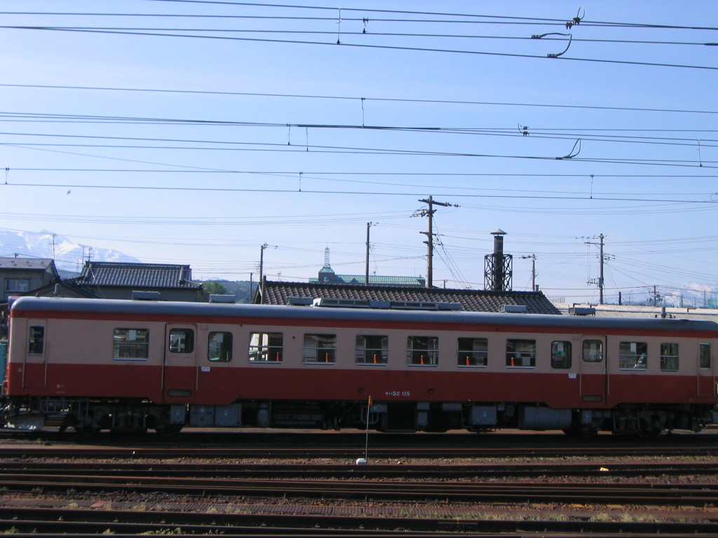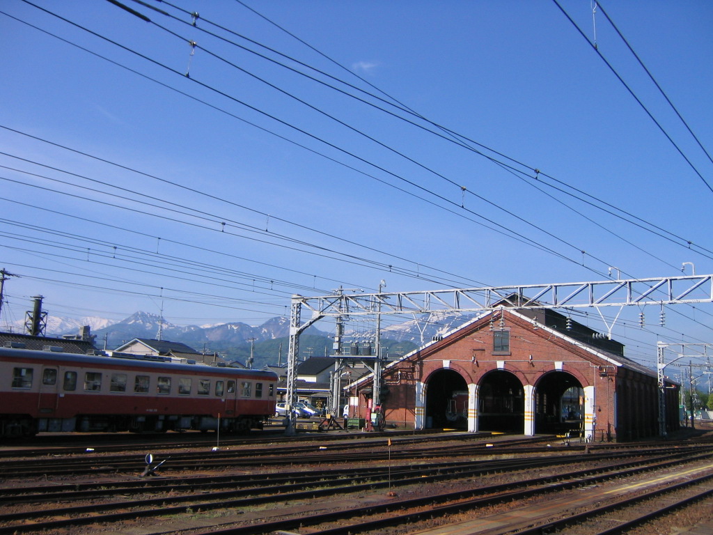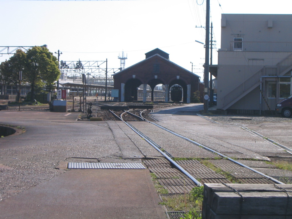 - かつての絲魚川機關區(糸魚川機関区)の象徴だったレンガ車庫は "新しい糸魚川駅" でモニュメントとして殘されました。 最後に見える國鐵色(国鉄色、朱色とベージュ)の氣動車はキハ 52-115 です。 2006 年 5 月 15 日撮影。
