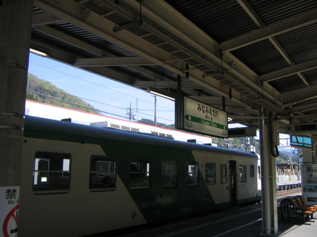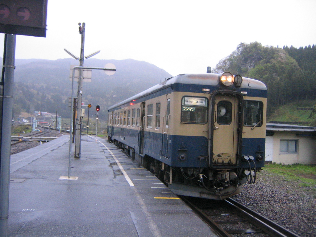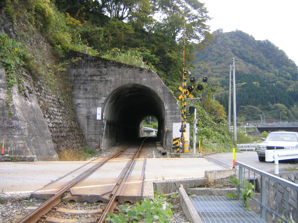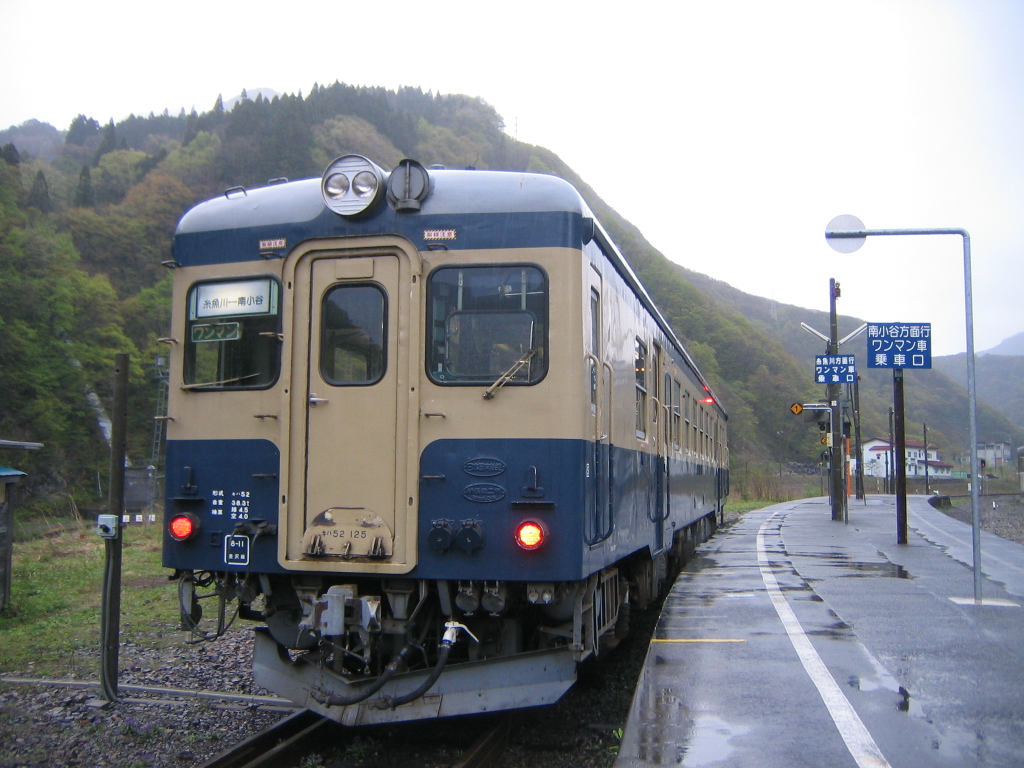 - 姫川驛附近を走行中の南小谷行 キハ 52-156。 竝走する 148 號線の自動車内から撮りました。 クルマは絲魚川市街へ向かってゐて擦れ違ひなのですが、列車の速度がそんなに速くないので割りとちゃんと撮れてゐる。 最後の寫眞は北小谷驛の下寺トンネルで絲魚川~松本閒が全通した 1957 年に竣工してゐます。 右端に寫ってゐるのは當時乘ってゐた Y31 セドリックセダン。 2006 年 4 月 26 日撮影