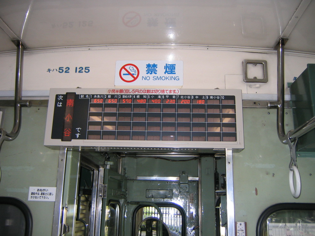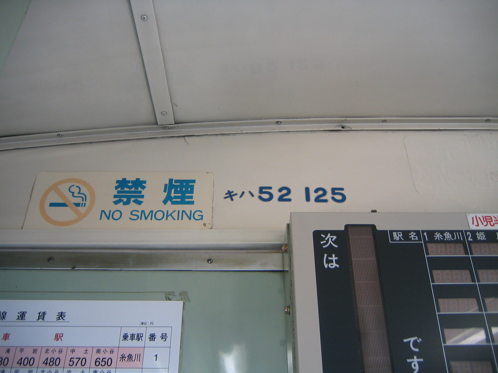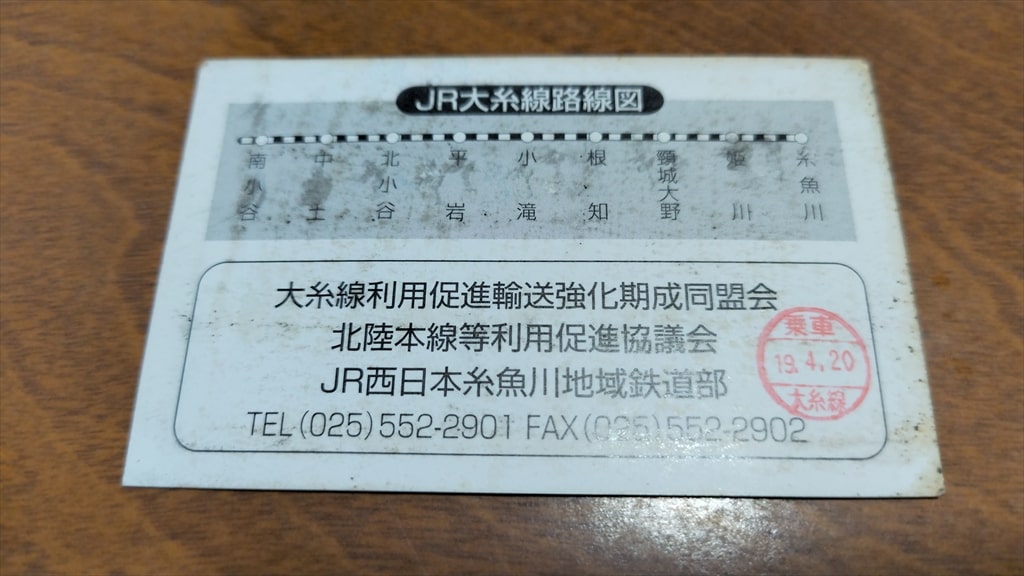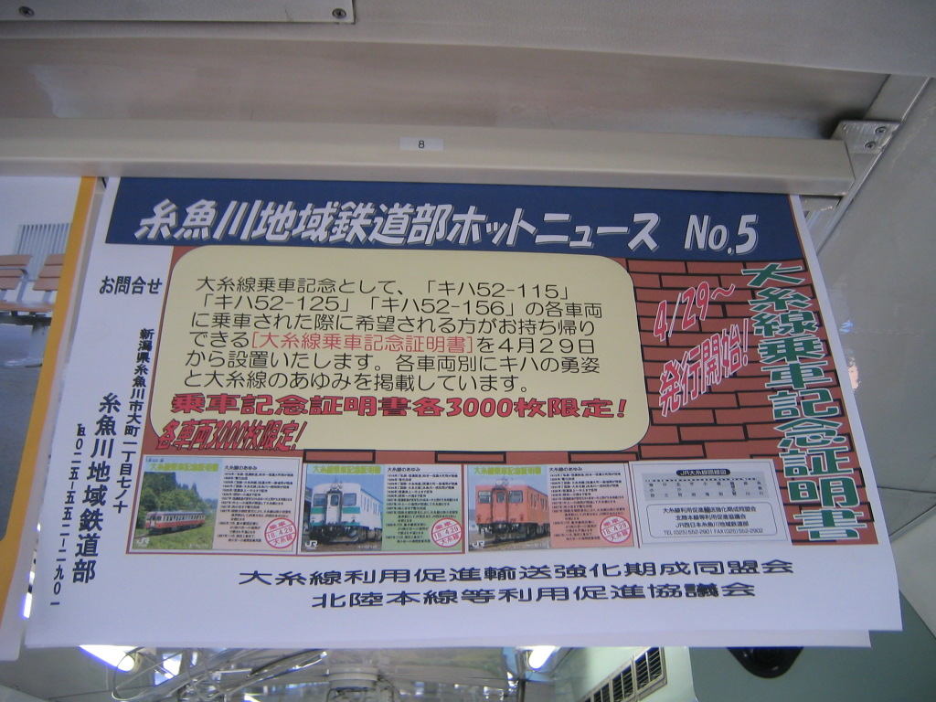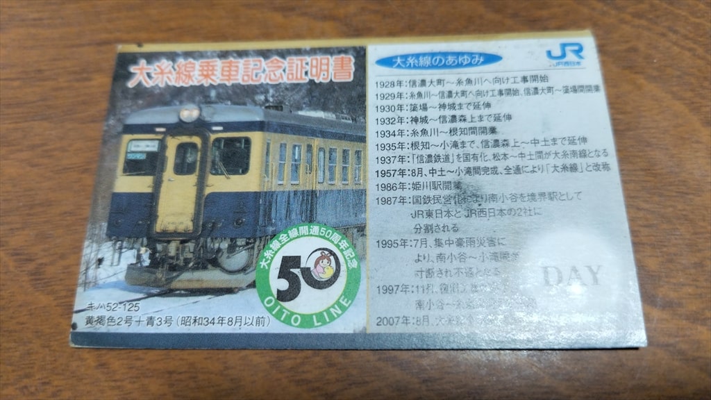 - 2007 年 4 月 20 日乘車。 長い間、サイフの中に入れてゐたので汚れてゐますが「大糸線乗車記念証明書」は 2006 年 4 月 26 日からキハ 52-125、キハ 52-156、キハ 52-115の各車輛に 3,000 枚づゝ用意されました。 料金箱橫に置かれて自由に取る事が出來ました。