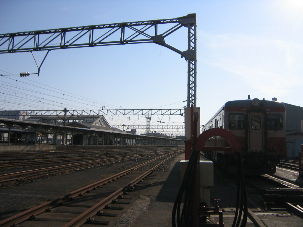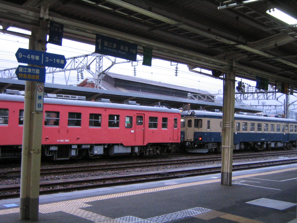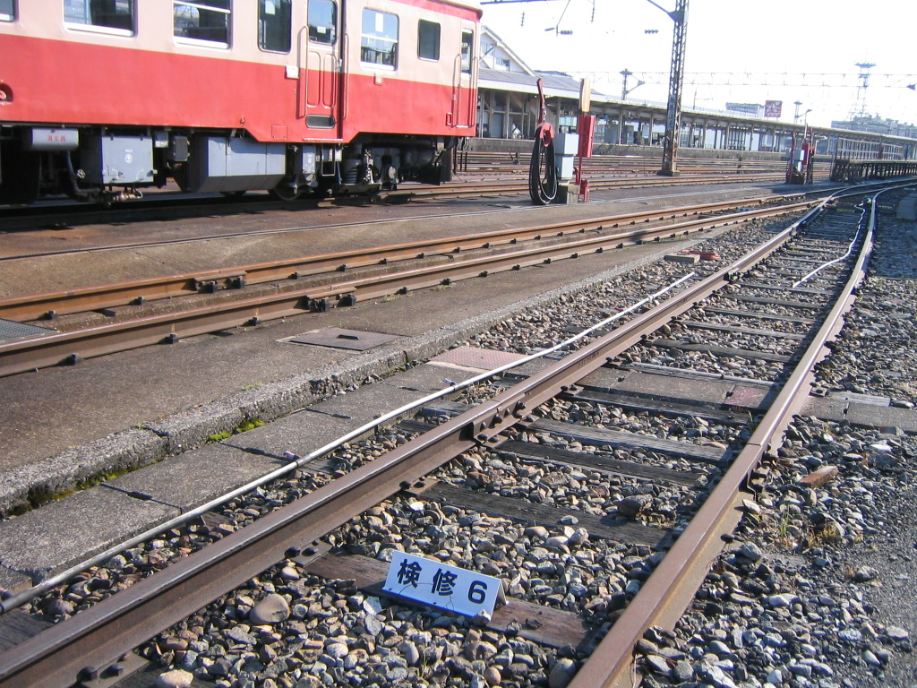 - 絲魚川驛ホームに留置されてゐるキハ 52-156 と、前で出發を待つキハ 52-125 です。 後ろに見える屋根は煉瓦車庫。 改札から 1 番線越しに撮影してゐます。 1 番線はもともと直江津・新潟方面ホームだったのですが、この頃は金沢・大阪方面のホームとしても使はれてゐました。 2009 年 4 月 27 日撮影。