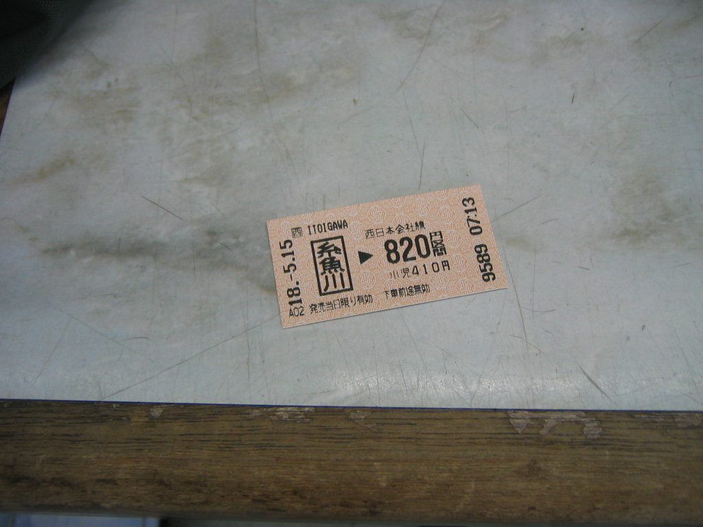 - 絲魚川驛~白馬驛の切符。 2006 年 5 月 15 日撮影。 當時の運賃は 820 圓。 南小谷~白馬は JR 東日本ですが切符には「西日本会社線」と刻印されてゐます。 いづれにしても大絲線經由で白馬驛へ行く事は東京に住んでゐる人はもちろんの事、大阪に住んでゐてもありません。 ちなみにキハ 52-125 の塗色は越美北線色でした。 この塗色は 2006 年で廢止されてゐます。