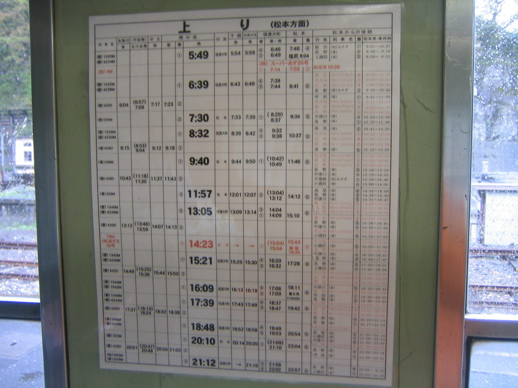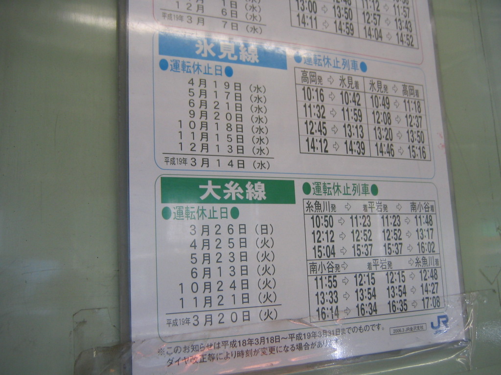 - 平岩驛で時間調整してゐるキハ 52-125 です。 2009 年 4 月 27 日撮影。 越美北線色ではなく紺とベージュの國鐵色に變更されてゐます。 尚、大絲線は絲魚川から南小谷が「上り」で、南小谷驛から新宿行の特急 あずさ 26 号( 14:23 發)が出てゐました。 南小谷驛時刻表( 2009 年 4 月)