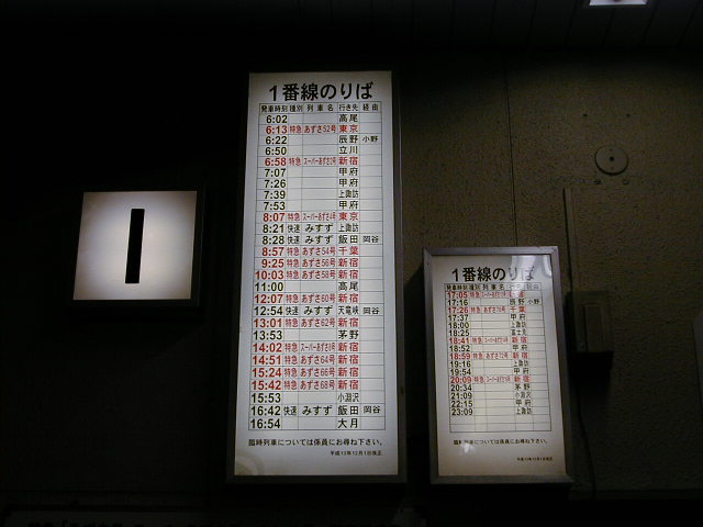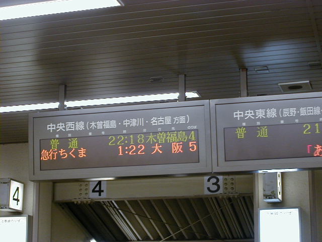 中央本線は東海道本線のように東京~京都・大阪を結ぶ構想で建設されました。 明治 44 年に全線が開通してゐます。 中山道(なかせんどう)の街道筋を結んでゐるので本來は東京~名古屋の列車が走ってゐても良ささうなのですが 現實には走ってゐません。 塩尻を境に東を中央東線( JR 東日本)、西を中央西線( JR 東海)と呼んでゐます。 かつての塩尻驛(舊驛)は途中驛だったのですが、昭和 57 年の線路の變更で直通列車は走らなくなりました。
