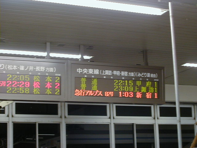 上野驛が「北の玄関」と言はれるのは、この驛を出發する列車が閒違ひなく全部 北を目指すからだと思ひます。 塩尻驛では同じ方向へ出發した列車が、片や東へ向かひ、もう一方は西を目指すといふのが面白い。 どちらも同じ中央本線です。 大阪驛では京都行きと神戸行きが 同じ方向に出て行くことは絶對にありません。 理窟では解かってゐるものの、實際に目の前にすると少し感動します。 しかも晉通の時刻表には載ってゐない貨物列車なら尚更です。 深夜 24 時 20 分、同時刻に二つの汽笛が鳴り響きます。