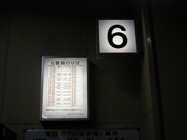 現在の塩尻驛は橋上驛で、島式ホームが3つ( 1~6 番線)配置されてゐます。 1・2 番線が主に中央東線、5・6 番線が中央西線で、3・4 番線は汎用的に使はれてゐるやうです。 長野・松本方面(篠ノ井線)から東京と關西を結ぶ "分水嶺の驛" と言っても良いかも知れません。 特急「あずさ」が東京へ、「しなの」は名古屋・大阪へ、それぞれこの驛から分かれて旅立ちます。