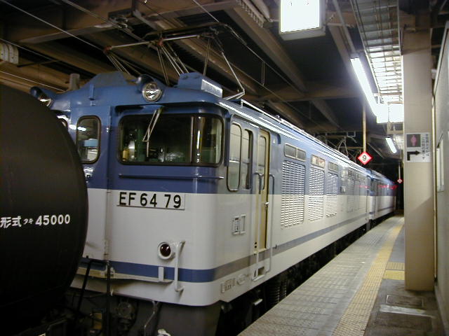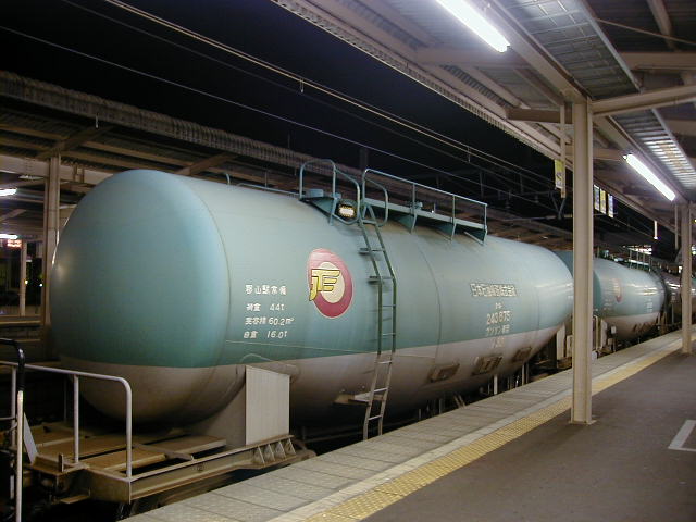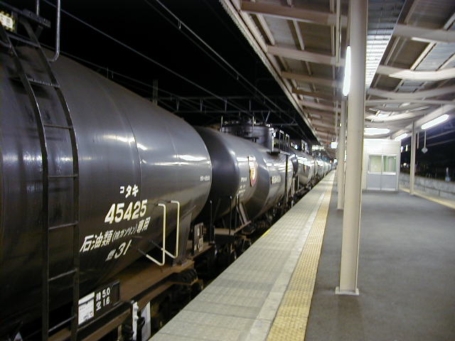 三重縣四日市市の四日市驛 コスモ石油側線(そくせん:專用ヤード)入りの貨物列車です。 發驛は南松本貨物驛(發驛コード:5141)。 後ろが見えないぐらゐタンク車オンリーの編成で、動力車は JR 貨物の看板機關車 EF64 (川崎重工製)の重聯(重連)です。 5番線に入線してゐます。 このホームは晝閒、名古屋方面の旅客列車が發着するホームで「しなの」なども こゝを使ひます。