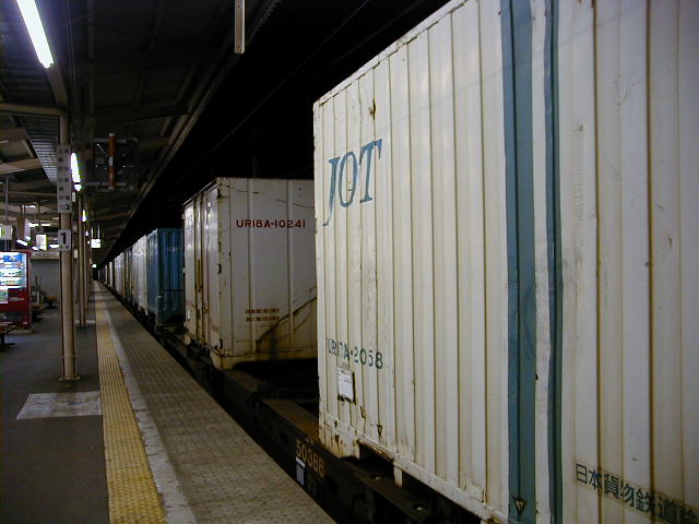 埼玉縣新座市の新座貨物驛行きの貨物列車です。 發驛は同じく南松本貨物驛。 こちらも後ろが見えないぐらゐのコンテナ專用車の編成ですが、動力車は EF64 が單機です。 重量的に輕いといふのではなく、途中の勾配が中央西線より緩やかなためだと思ひます。 1番線に入線してゐます。 このホームは晝閒、東京方面の「あずさ」が使ふホームです。