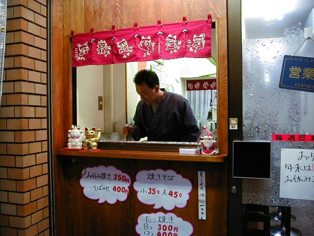 - ジャスコ側のバス乘場(舊北大阪線停畱所)の方へ出て下さい。 さくら銀行右橫の道を入ったところです。 國道 2 號線の方へは行かないように。 左手に をばちゃんがやってゐ「たこ燒き屋」が見えれば正解です。 こゝのたこ燒きは美味い。 店はわりと新しいのですが、をばちゃんは地元の人。 歸り道に寄りませう。(ただし 8 時頃まで)