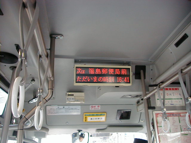 - 野田阪神バスターミナルを出發して直ぐ、バス車内のデジタル表示板です。 まだ新車の匂ひがします。