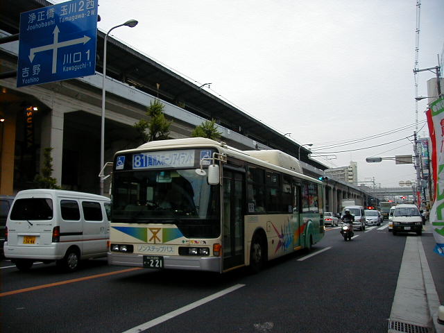 環境に優しく、人に優しいバスと言へば、コレ。 大阪市内でも十數臺しか走ってゐません。 大阪市交通局 酉島(此花區)と鶴町(大正區)にそれぞれ 4 ~ 5 臺で、その他には數臺あるだけだらうと云ふ事でした。 天然ガス車は多いのですが、低牀は まだ珍しいやうです。 このバスは酉島配屬で、ユニバーサル・スタジオズ・ジャパン™ のそばを通って舞洲に向かいます。 ちなみに運轉手さんに聞いたところ、スタンドは一般の天然ガススタンドを利用してゐて結構混むさうです。 ただし、鶴町には車庫内に專用スタンドがあるさうです。
