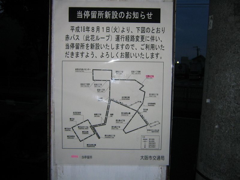 - 停畱所の設置場所は福島區ですが此花區の此花北ループの赤バス停畱所です。 福島ループが擴張されたやうに此花ループも平成 18 年( 2006 年) 8 月 1 日から廣がりました。 寫眞は直前の 7 月に撮ってゐます。