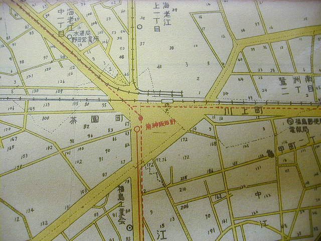 - 昭和三十年代の阪神 野田驛の地圖(出典:福島圖書館)と、かつての路面電車停車場址地。 阪神本線の野田驛の北側に沿って電車線が二本入ってゐるところが乘り場(野田停車場)でした。 ちなみに地圖に據ると阪神 野田驛の邊りまで茶園町だった事が判󠄁ります。